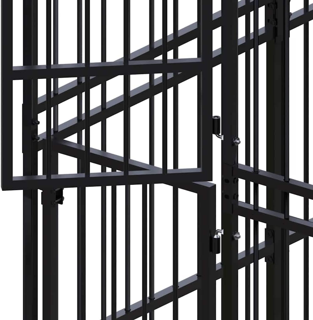 This versatile dog kennel features multiple uses: playing, exercising, training, or simply keeping your dog safe. It will be the perfect play paradise for your furry friends!This dog kennel provides ample exercise space. The walls of steel bars help prevent mischief and unexpected accidents while enabling ventilation. Thanks to the sturdy powder-coated steel construction, this dog kennel is durable and built to last. The roof provides protection from sun, rain, snow, as well as other weather conditions. The hinged door with a lockable latch system ensures extra security and safety for your dogs.Color: BlackMaterial: Powder-coated steelOverall dimensions: 40.6″ x 78.7″ x 89.8″ (L x W x H)Door size: 19.7″ x 70.9″ (W x H)With a door and roofLockable latch systemAssembly required: Yes