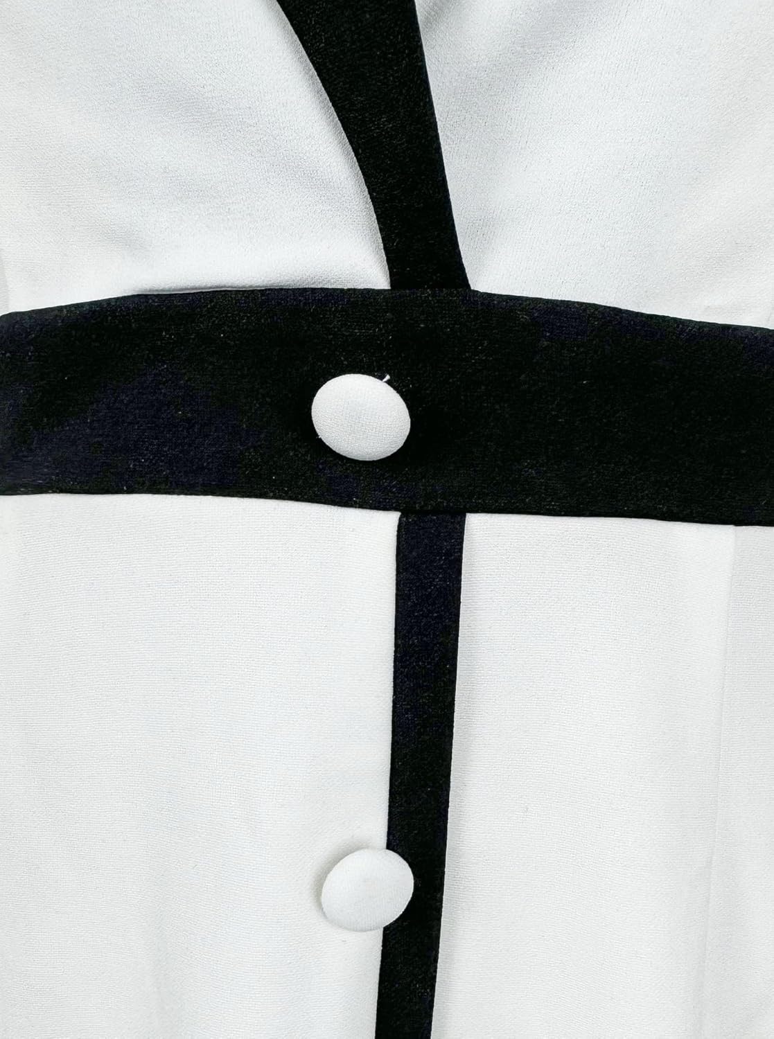 Make a striking statement in this sophisticated midi dress that perfectly balances timeless elegance with modern design. The crisp white fabric is beautifully accented with bold black contrast trim along the lapels, cuffs, and hem, creating a stunning monochromatic look. The tailored silhouette features a flattering V-neckline, long sleeves with turned-back cuffs, and a row of buttons down the front. A defined waist is achieved through the included black belt, while the midi-length cut offers versatile wear. The dress combines classic coat dress styling with contemporary details, making it suitable for both professional settings and special occasions. The structured fabric maintains its shape throughout wear, while the thoughtful design includes practical side pockets. This piece can be styled with pearls for a classic look or contemporary accessories for a modern twist. The contrast trim details add definition to the clean lines of this sophisticated dress, creating a polished and memorable ensemble.