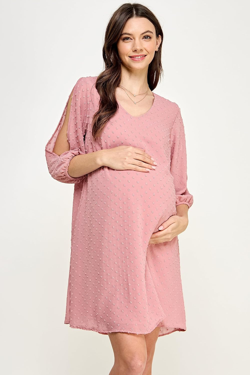 Feel chic and confident in our Swiss Dot Maternity Dress! The slitted sleeves add a stylish touch while the lightweight fabric keeps you comfortable throughout your pregnancy. Embrace your bump in this cute and versatile dress.