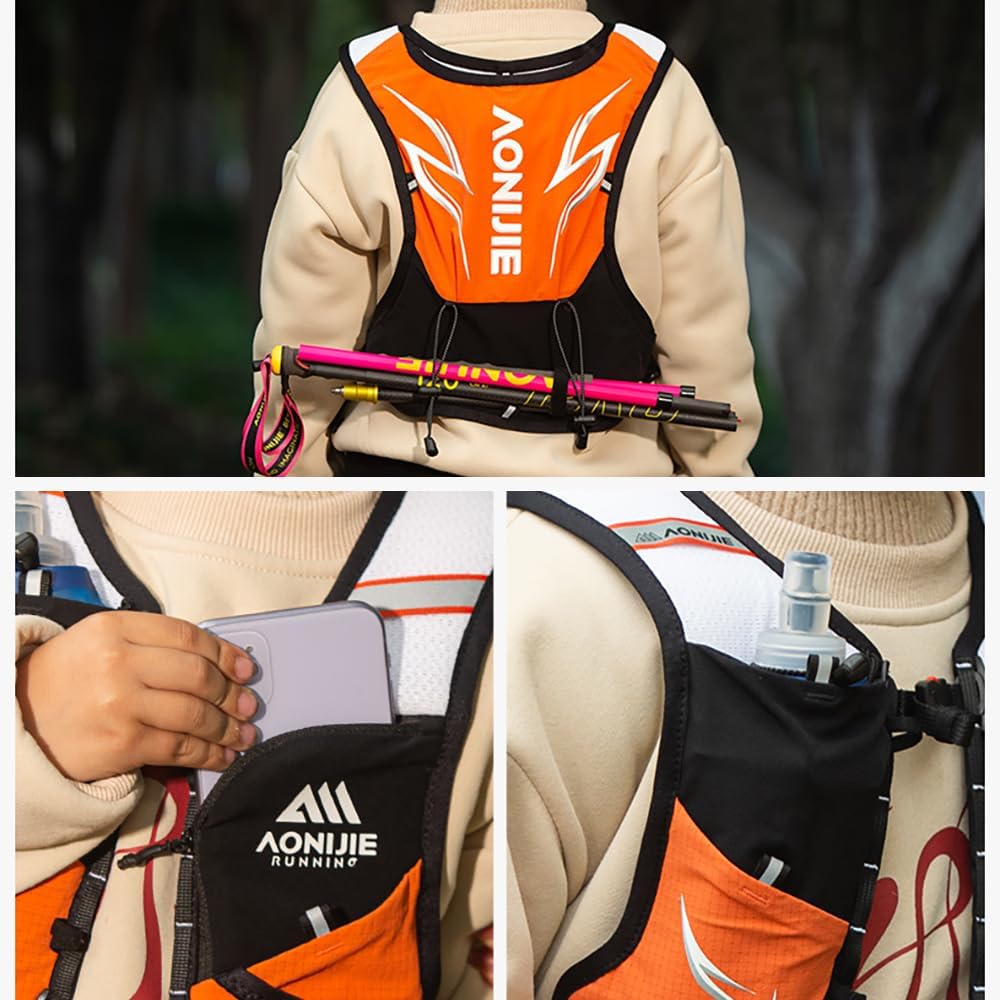 Playful clashing colors, fashionable and bright. Let's keep the kids a child's heart and keep moving forward! Specification: Color: Blue Orange Fluorescent Yellow Black and White Weight: 130g Net: Polyester Fabric 1: 87%Nylon,20%Spandex Fabric 2: 84%Nylon,16%Spandex Fabric3: 90%Nylon,10%Spandex Chest Circumference Recommended:62-90cm/24.41-35.43 inch Package Content: 1* Kids Hydration Backpack