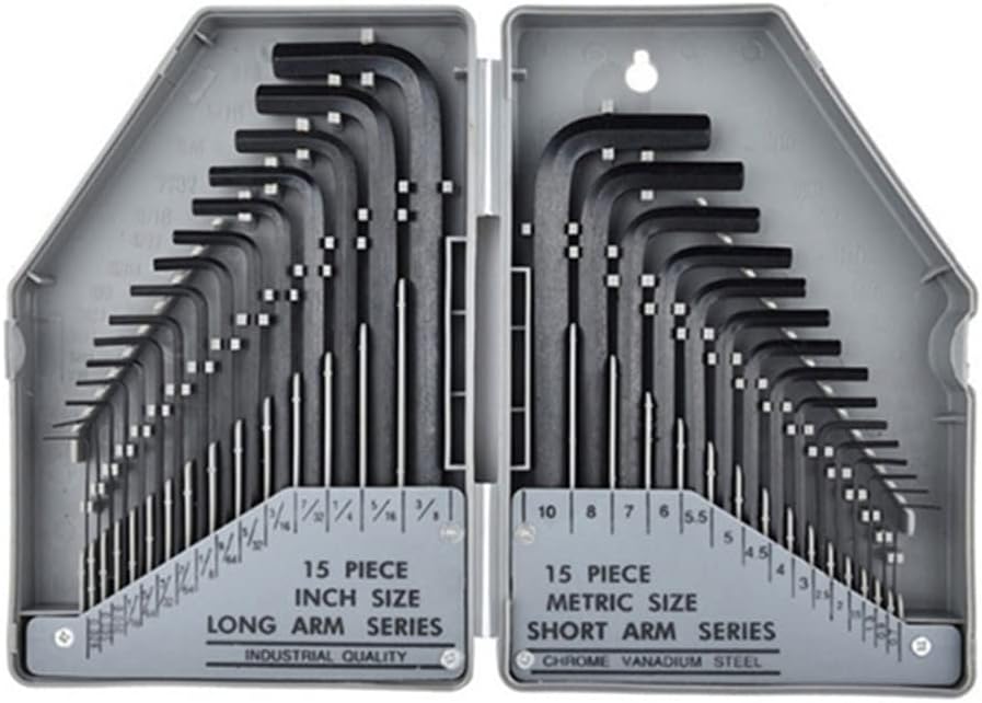 Specification: Material: Carbon steelWeight: approx.790gColor: Gray/OrangeBox Size: approx.18.7x12.6x10.9x9.6x7.4mm/7.4x5.0x4.3x3.8x2.9inPackage: 30PcsIncludes 30-pcs. long pattern hex key wrenches: 0.028, 0.035, 0.050, 1/16, 5/64, 3/32, 7/64, 1/8, 9/64, 5/32, 3/16, 7/32, 1/4, 5/16, 3/8 in, 15-Pcs; short pattern hex key wrenches: 0.7, 0.9, 1.3, 1.5, 2, 2.5, 3, 4, 4.5, 5, 5.5, 6, 7, 8, 10 mm, 15-Pcs; Storage case.Precisely sized, chamfered, straight ends offer a snug fit and insert smoothly into fastener , reducing wear.Black oxide finish protects against corrosion without added plating that could chip off under high-stress .Long arm/short arm design offers extended reach on end and extra leverage on the other.Storage case opens flat, making it easier to get wrenches in and out.Easy-to-read sizes marked on case for fast size selection.Package Includes: 30Pcs x Allen WrenchNote:Due to the different monitor and light effect, the actual color of the item might be slightly different from the color showed on the pictures. Thank you!Please allow 1-2cm measuring deviation due to manual measurement.The allowable measurement error is +/- 1-3cm.