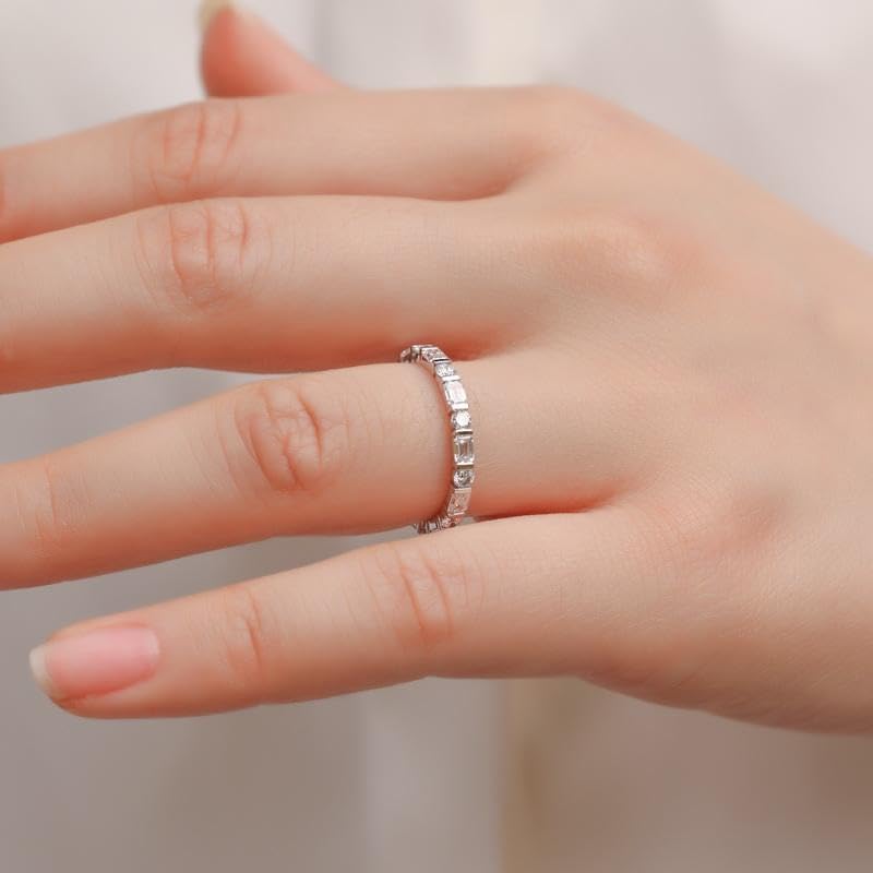 Celebrate timeless elegance with this Baguette & Round Moissanite Full Eternity Wedding Band. Expertly crafted in genuine 925 sterling silver, this ring showcases alternating baguette and round moissanite stones that sparkle from every angle. The full eternity setting represents infinite love and commitment, making it a meaningful choice for a wedding band, anniversary ring, or promise ring. Designed with a refined and minimalist profile, it complements engagement rings perfectly or shines beautifully on its own. A luxurious yet classic piece made to be treasured for a lifetime.