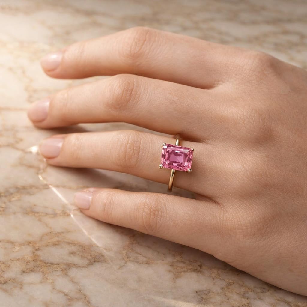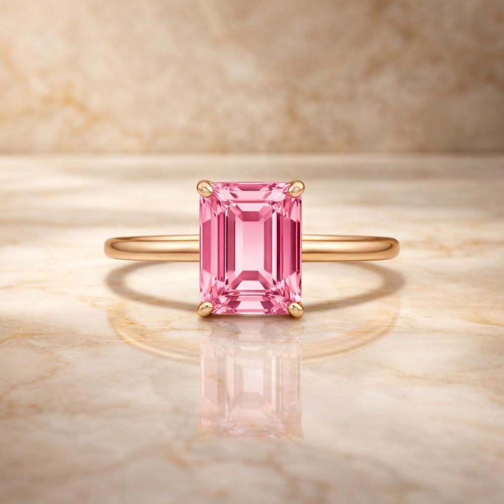 This stunning emerald cut pink sapphire solitaire ring showcases modern elegance combined with timeless charm. The beautifully faceted rectangular gemstone displays delicate blush pink hues with remarkable brilliance and clean lines that create a bold yet graceful appearance. The yellow gold finish band offers a warm luxurious contrast to the vibrant pink stone enhancing its sparkle while maintaining a minimalist and refined aesthetic. The balanced proportions and sleek design make this ring both contemporary and classic. Whether chosen as an engagement ring promise ring or anniversary gift this elegant piece symbolizes romance strength and devotion. Crafted with attention to detail and secure prong setting this ring ensures durability comfort and long lasting beauty for everyday wear or special occasions. A sophisticated and romantic jewelry piece that leaves a lasting impression and celebrates refined craftsmanship.