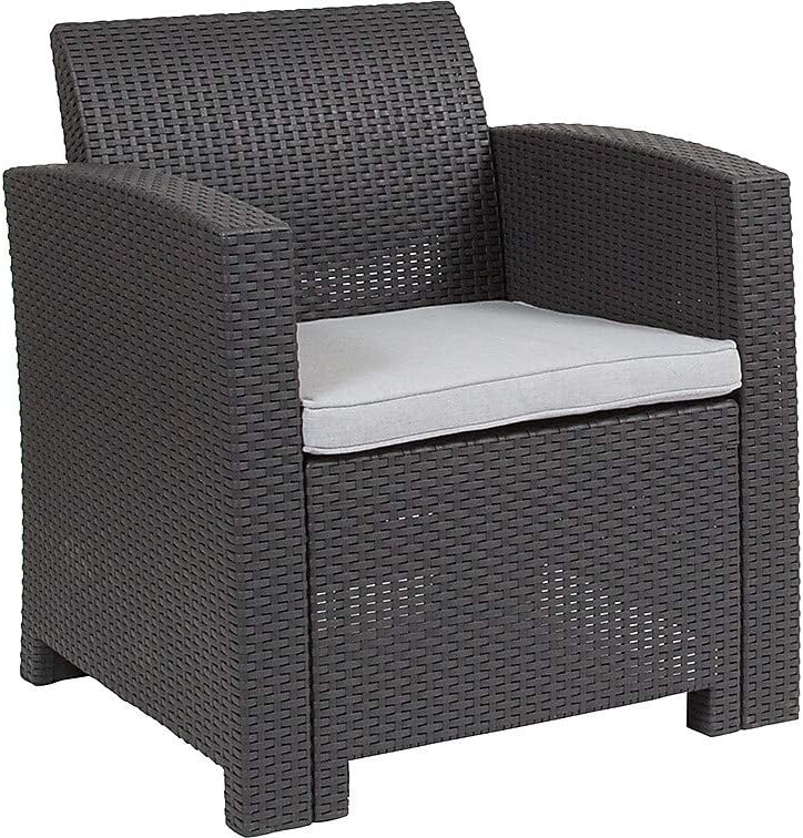 Create an amazing outdoor space with this comfortable and stylish light gray patio chair. The durable resin frame offers a stylish appearance which replicates rattan. Deep seating enhances the comfort level. Light gray all-weather cushions will hold up all season long. Clean spills with a water-based cleaner or the cushions are zipper removable for washing purposes. Curl up with your latest read, or just relax and enjoy the outdoors with family and friends and create lasting memories!