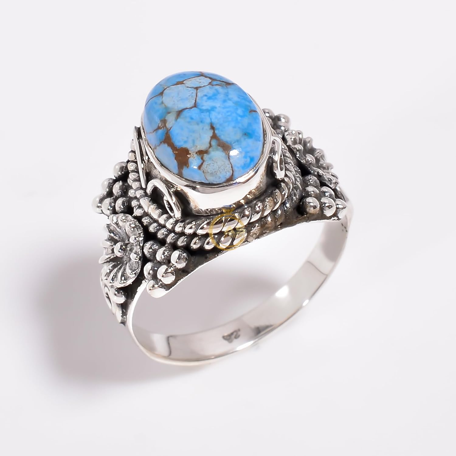 This handmade boho ring features a natural Golden Hill turquoise stone set in 925 sterling silver, showcasing the stone’s distinctive pale blue tones with warm golden-brown matrix patterns unique to this rare variety. The organic shape and intricate silver detailing highlight the earthy character of the turquoise, giving the piece an artisanal, free-spirited feel. With its bold yet grounded aesthetic, this ring captures a blend of rustic charm and bohemian elegance, making it a standout accessory for those drawn to natural textures and unique stones. 》Product Details:- Product - Ring Metal - Pure 925 Sterling Silver Stamp - 925 Gemstone - Golden Hill Turquoise Gemstone Color - As seen in the picture but may some vary in color and pattern Gemstone Shape - Oval Gemstone Treatment- No Treatment (Natural) Product Weight – 6.40gm Approximate 》About Quality:- Our products are completely handmade and made of pure 925 sterling silver and natural gemstones, so don't worry about the quality, 100% customer satisfaction guaranteed. 》Please Note:- Because it is a natural gemstone, some slight variations in color and pattern are expected. 》Thank you for visiting my shop!