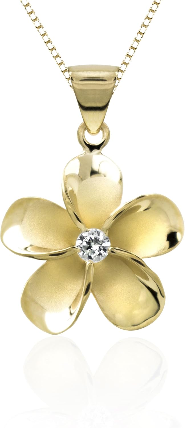 A silver plumeria necklace with yellow gold finish. Flower has a smooth sandblast finish and high polished petal edges. Comes with a 16"-18" adjustable box chain. Gift box included. From Honolulu Jewelry Company, Honolulu, Hawaii.